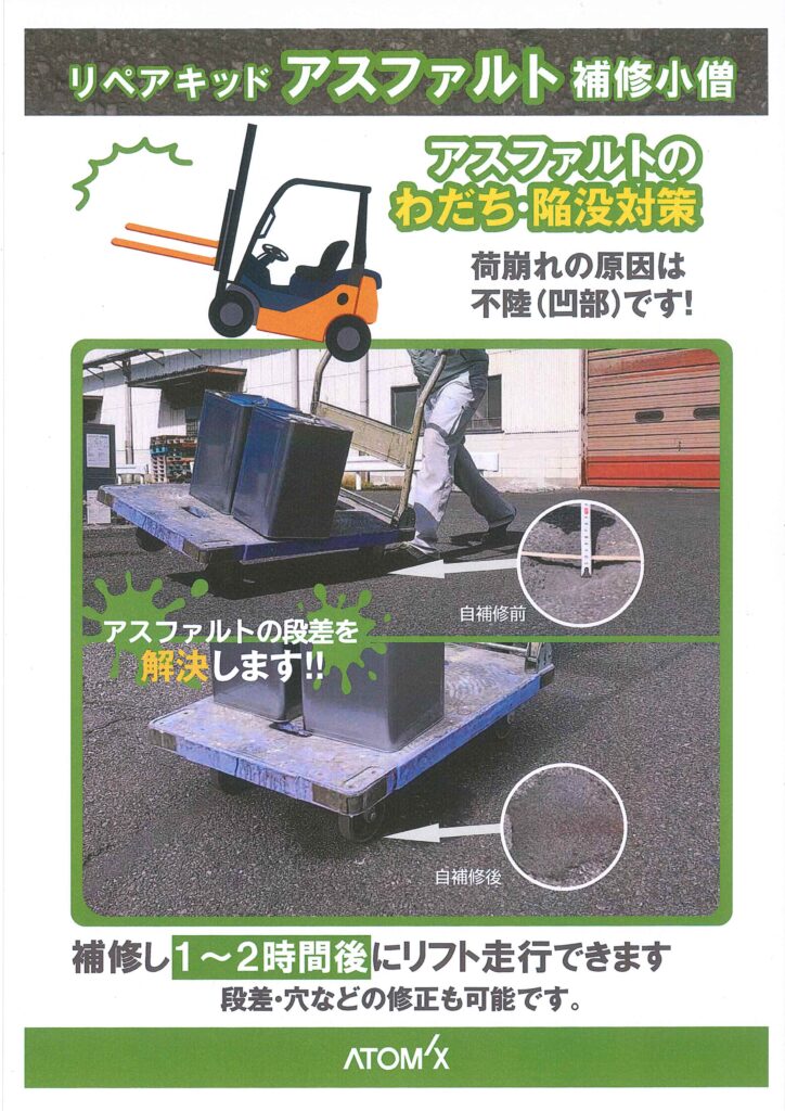 お知らせ News ホーム > 新着情報 > リペアキッドアスファルト補修小僧 おすすめ商品 公開日:2026.03.27 リペアキッドアスファルト補修小僧 アトミクスより、ホカホカの新商品のご紹介です。 リペアキッド補修小僧のコンクリート用に新しくアスファルトに使用できる商品が仲間入り! アスファルトのわだち・陥没対策!荷崩れの原因は不陸です! リペアキッドアスファルト補修用キット !補修後1~2時間後にリフト走行できます! 11KGセット当たりの施工面積の目安 5MM=約1㎡ 10MM=約0.5㎡ 15MM=約0.33㎡ 20MM=約0.25㎡ 前の記事へ 一覧へ戻る