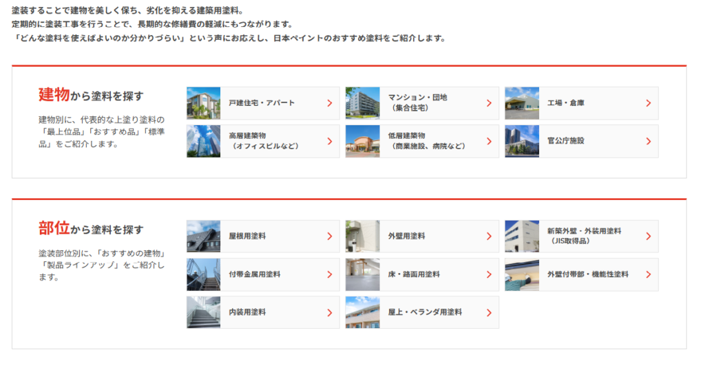 お知らせ News ホーム > 新着情報 > 日本ペイントウェブサイト 「建築用塗料ページ」リニューアルのご案内 お知らせ 公開日:2026.01.09 日本ペイント株式会社 日本ペイントウェブサイト 「建築用塗料ページ」リニューアルのご案内 「建物から塗料を探す」では、建物別に、代表的な上塗り塗料の「最上位品」 「おすすめ品」 「標準品」 をご紹介しております。 ↓ 画像クリックでサイトに移動します。 前の記事へ 一覧へ戻る