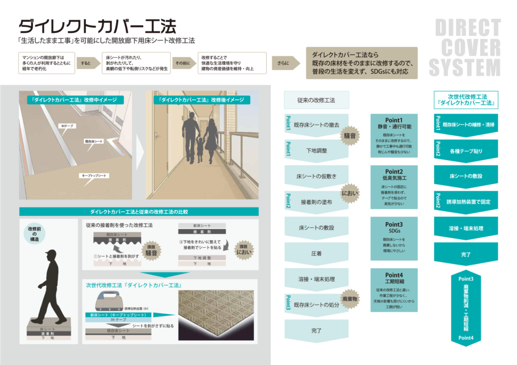ダイレクトカバー工法とは、既存の床シートの上から新たな床材を重ねて施工する改修工法です。